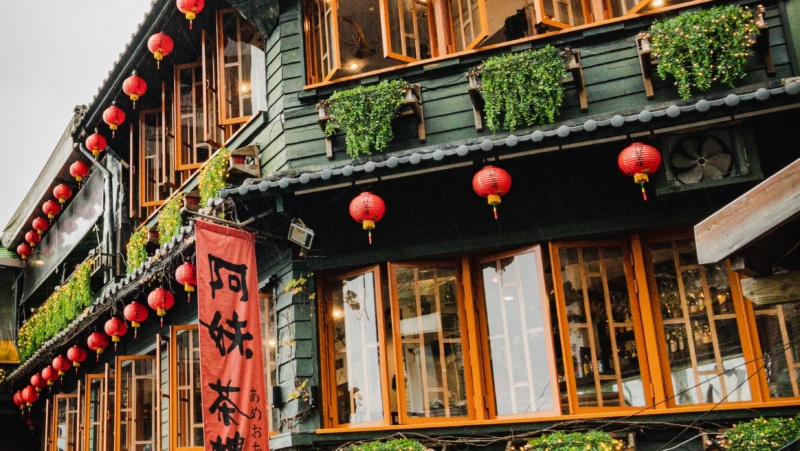 Step into the charm of this historic teahouse, adorned with vibrant red lanterns and lush hanging greenery along its multi-tiered facade. The traditional architecture and warm lighting evoke a sense of timeless Asian heritage, captured from a low-angle view that…