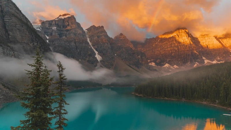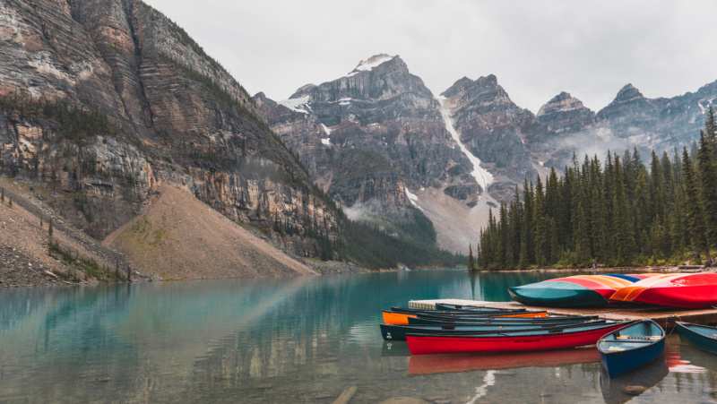 mmerse yourself in the serene beauty of this crystal-clear mountain lake, nestled between towering peaks and dense pine forests. Colorful canoes add a vibrant touch, reflecting perfectly on the calm waters, captured from an aerial perspective that enhances the majestic…