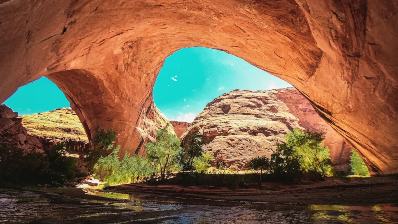 Capture the awe-inspiring beauty of this stunning natural arch, carved by time in the rugged desert landscape. The vibrant blue sky peeks through, contrasting with the warm red rocks and lush greenery below, offering a breathtaking view of nature’s artistry.…