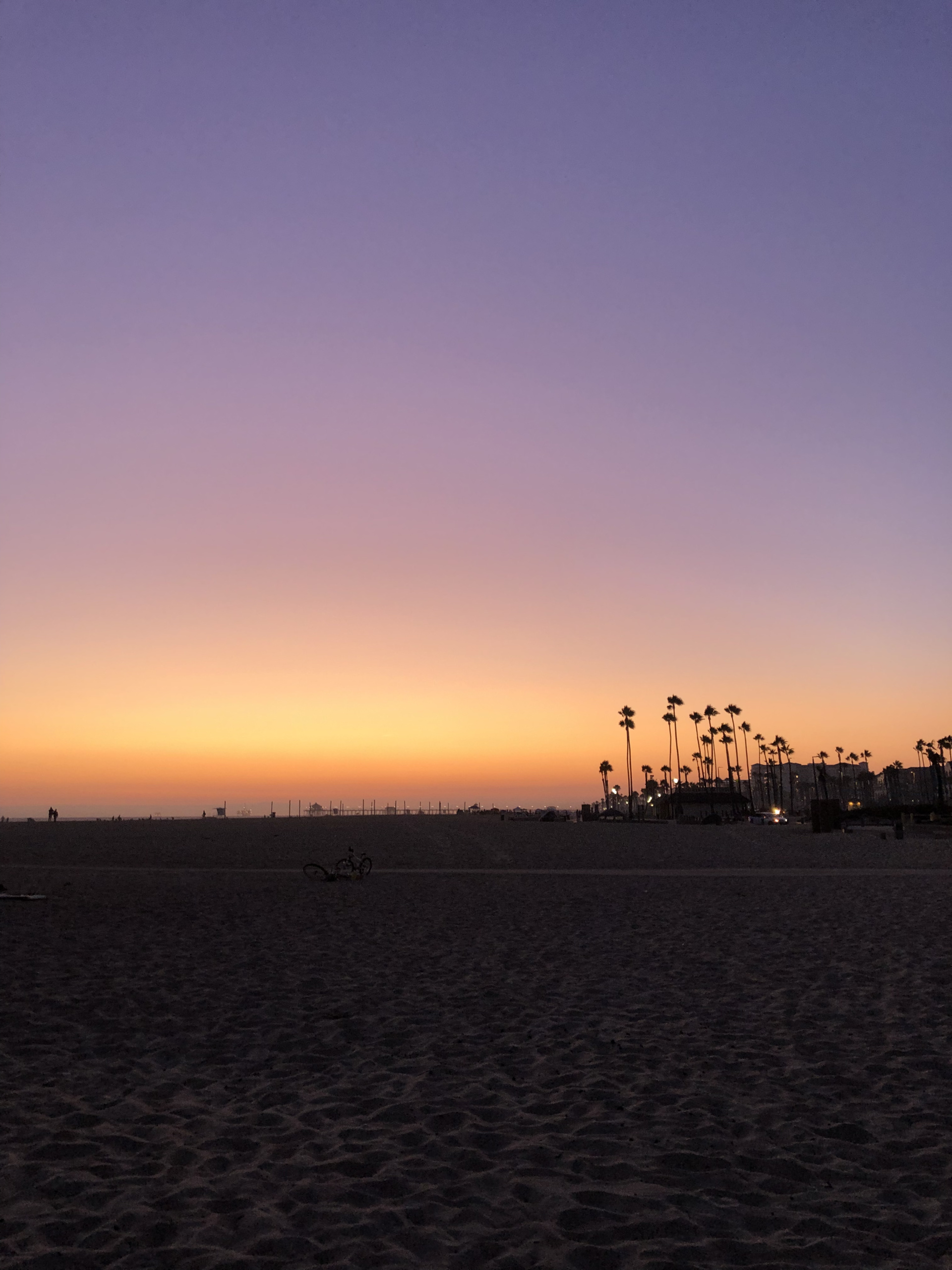 Experience the tranquil beauty of a coastal sunset, where the sky blends from deep purple to warm orange hues. Silhouetted palm trees and a quiet beachfront create a peaceful scene, perfectly captured from an aerial view to showcase the serene shoreline.